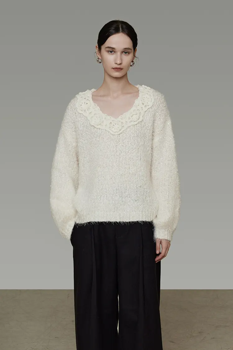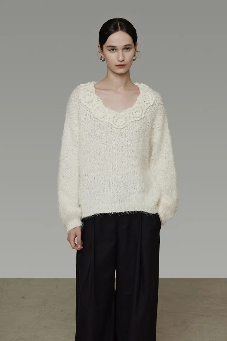 Le pull en dentelle 3D pour femme présente un col en V profond. Le bord du décolleté est orné d'une exquise dentelle ajourée brodée, complétée par de petits boutons en tissu du même tissu. Le savoir-faire de la dentelle tridimensionnelle est clairement superposé, avec des détails délicats et doux. L’aspect général est doux, romantique et pourtant élégant. Qu'il soit vu de face ou de dos, il possède un fort sens du design, permettant au pull basique de couleur unie de rompre avec la monotonie et de rehausser sans effort la sophistication de la tenue. Il convient parfaitement aux consommateurs qui apprécient les détails et la texture.