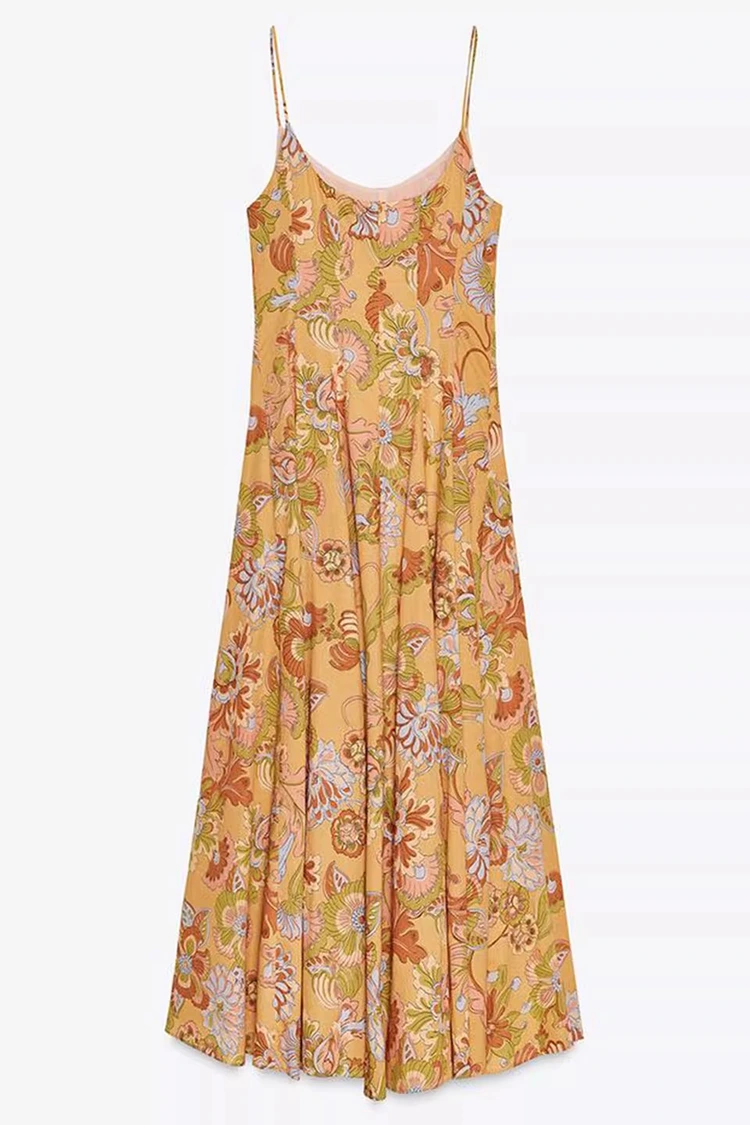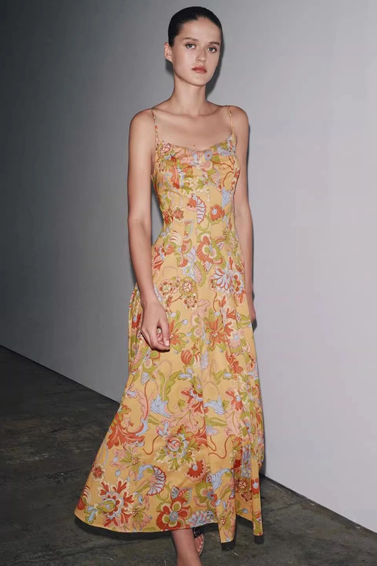 La robe d'été en coton à imprimé floral pour femme a une couleur de base orange clair, avec des imprimés floraux richement texturés couvrant toute la surface. Les tons chauds et doux apportent de la vitalité, comme si tout un jardin d'été fleuri se portait sur le corps. Il allie une atmosphère rétro romantique à une ambiance estivale décontractée. La silhouette présente un design sans manches et suspendu au cou, avec des lignes épurées et rafraîchissantes, qui peuvent révéler habilement les lignes des épaules et du cou, façonner la silhouette proportionnellement et en même temps se libérer des contraintes des manches courtes, répondant aux besoins vestimentaires de l'été chaud. L'ourlet de la jupe est ample et modéré, peu exigeant sur la forme du corps et peut facilement cacher les défauts mineurs de la taille, de l'abdomen et des jambes, étant très convivial pour les femmes de tous types de corps. La combinaison parfaite d'un imprimé rétro et d'une silhouette élégante permet à cette robe non seulement de mettre en valeur le charme féminin des femmes, mais également de conserver un style décontracté et détendu, dépassant les limites d'une seule tenue et s'adaptant à différents styles de création.