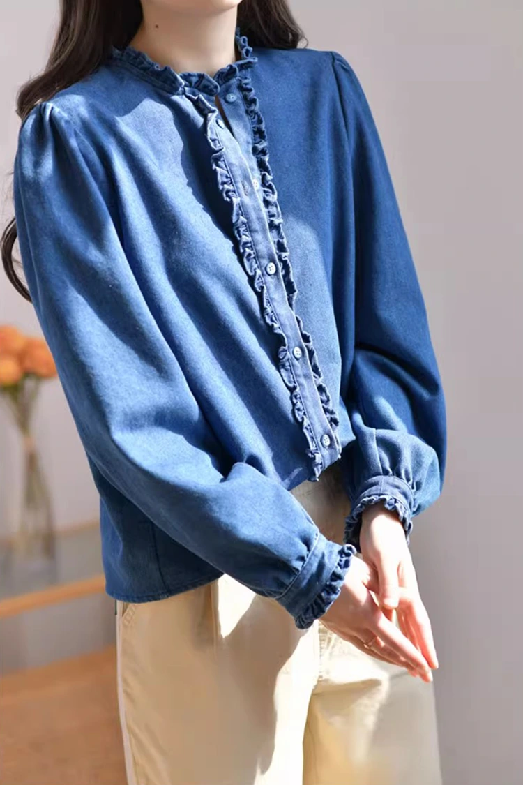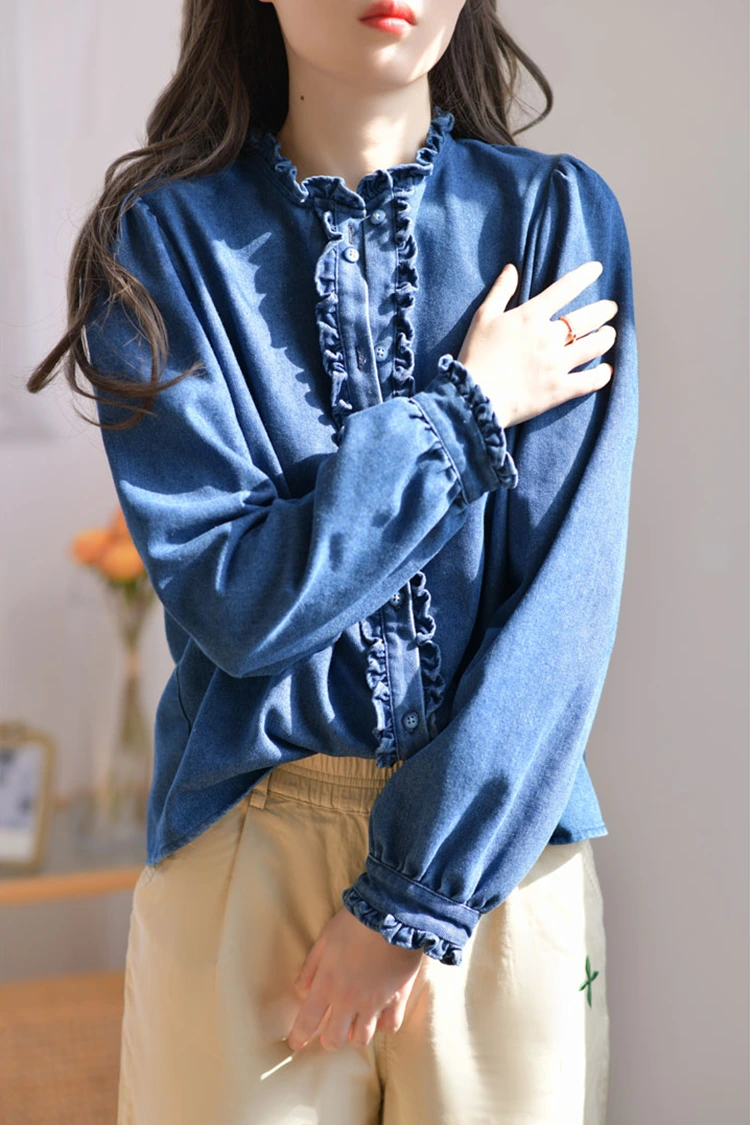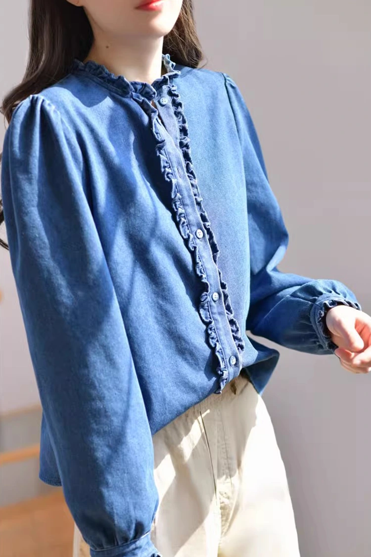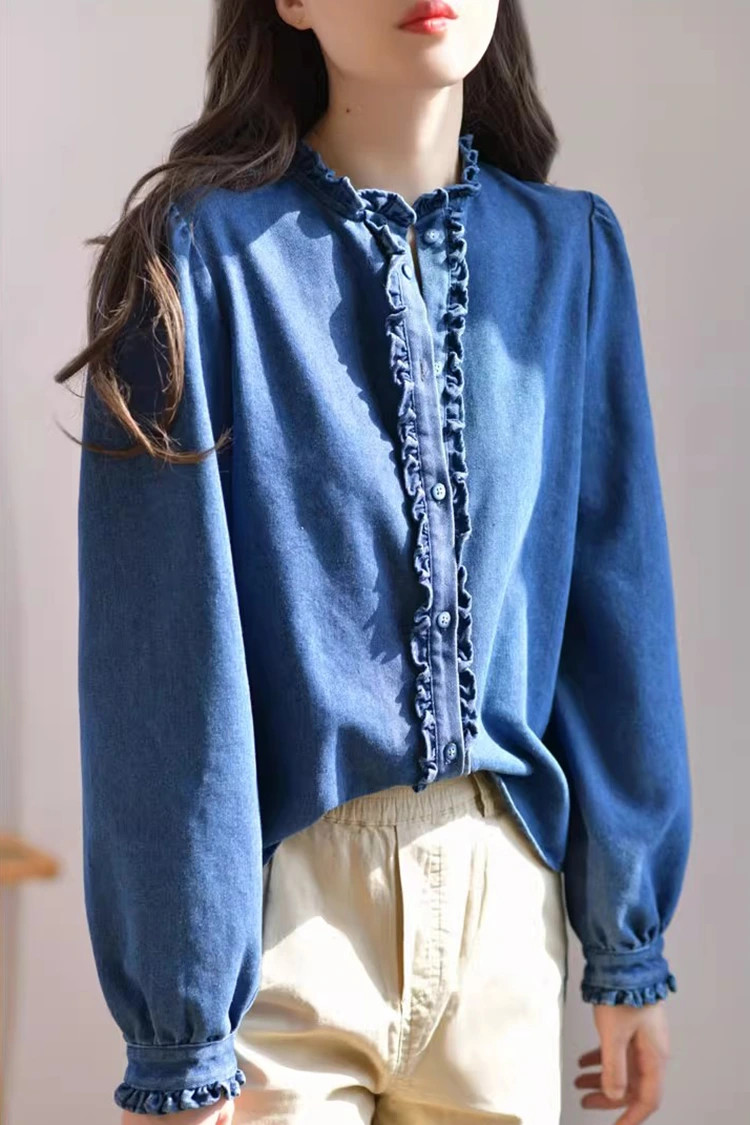 Le chemisier décontracté en denim pour femme adopte un motif rétro et décontracté, épousant précisément la forme du corps des femmes. Cela ne dépend pas du type de corps et peut non seulement affiner les lignes des épaules et du cou, mais également masquer l'excès de graisse au niveau de la taille et de l'abdomen. Il répond aux besoins de différentes morphologies. Le col est conçu comme un col montant, associé à de superbes bords volants. L'ouverture sur le devant et les poignets sont également ornés de délicats bords volantés. Associé aux manches longues duveteuses et en forme de lanterne, il allie parfaitement l'élégance rétro et l'aisance décontractée. Le motif simple de couleur unie est classique et durable, et ne se démodera pas. Il peut créer un look décontracté au quotidien ou un style professionnel simple, et est très pratique.