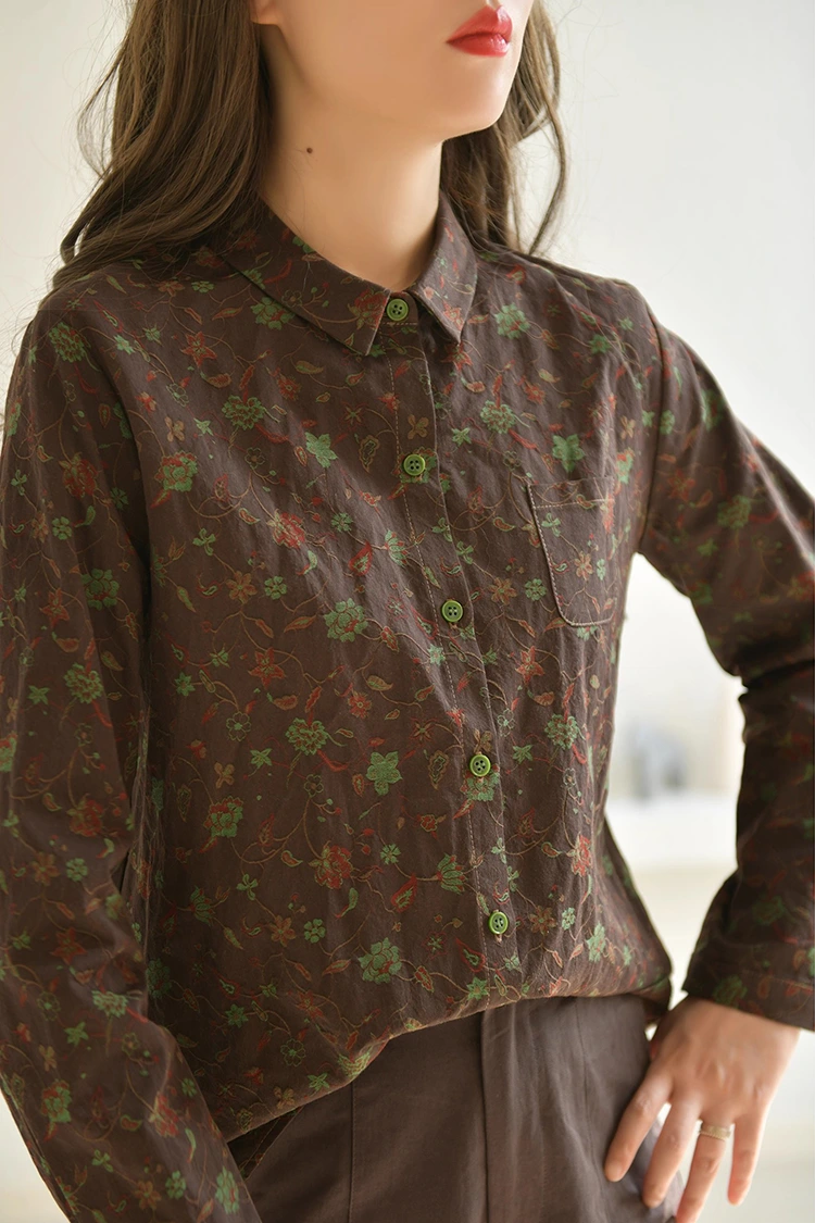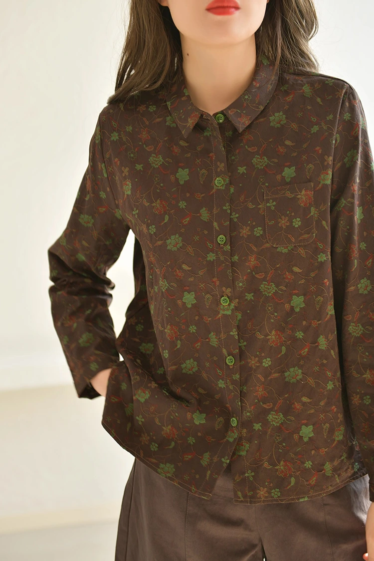 Le chemisier décontracté à imprimé floral pour femme adopte un design esthétique rétro qui s'adresse au marché européen et américain. Il reflète précisément la recherche des consommateurs locaux pour les styles artistiques et rétro, tout en tenant compte du caractère inclusif du motif. La chemise a une couleur de base marron foncé et est recouverte d'imprimés rétro à motifs de vigne. La tonalité des couleurs est stable et grandiose, créant une atmosphère artistique élégante. Différent des styles imprimés ordinaires, il peut rapidement se démarquer parmi les produits similaires et créer un avantage de différenciation pour le magasin. Le motif adopte un design simple à petits revers, simple et élégant, et s'adapte au style vestimentaire décontracté de l'Europe et de l'Amérique. La conception ample des épaules est adaptée à différents types de corps et peut modifier efficacement la largeur des épaules, la taille et l'abdomen, sans être pointilleuse sur la forme du corps, adaptée aux consommateurs de différents types de corps en Europe et en Amérique, élargissant considérablement l'audience des ventes de terminaux et améliorant le taux de retour des achats.