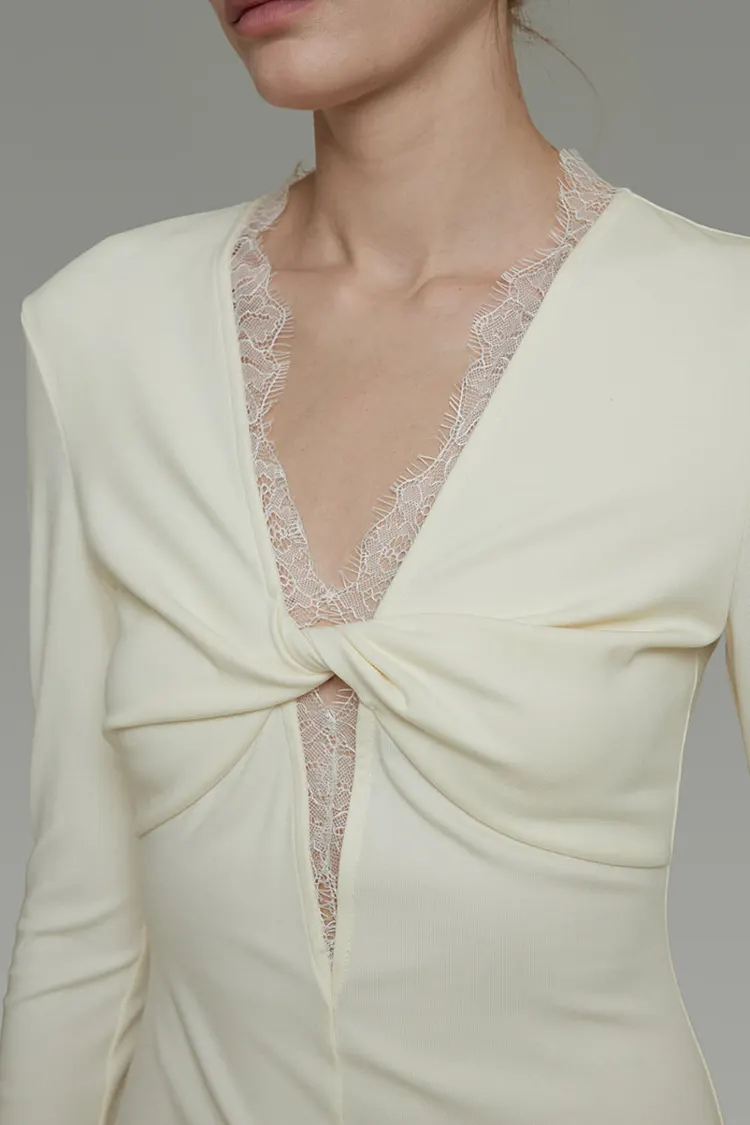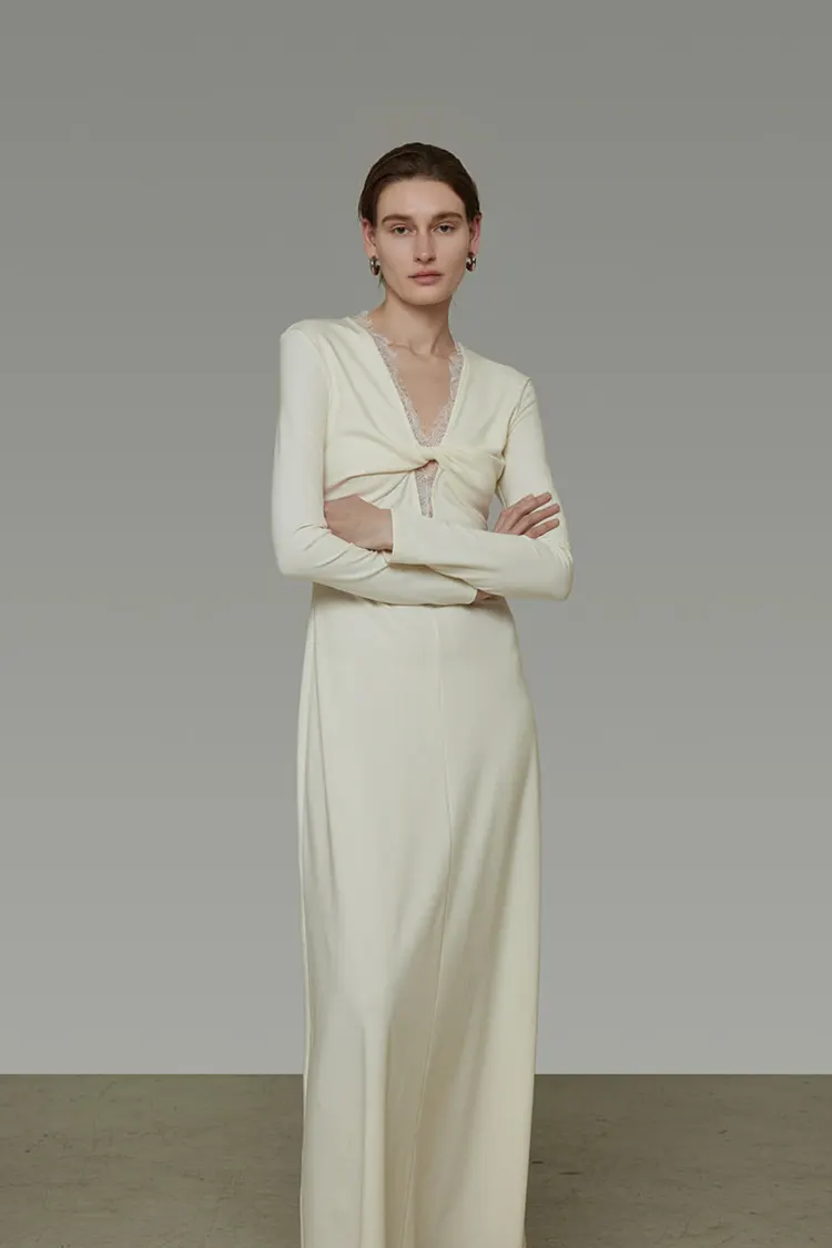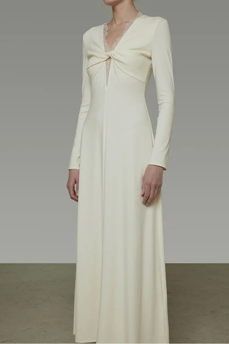 La dentelle le long du col en V est méticuleusement fixée à la main avec des coutures soignées, s'intégrant parfaitement à la silhouette de la robe.