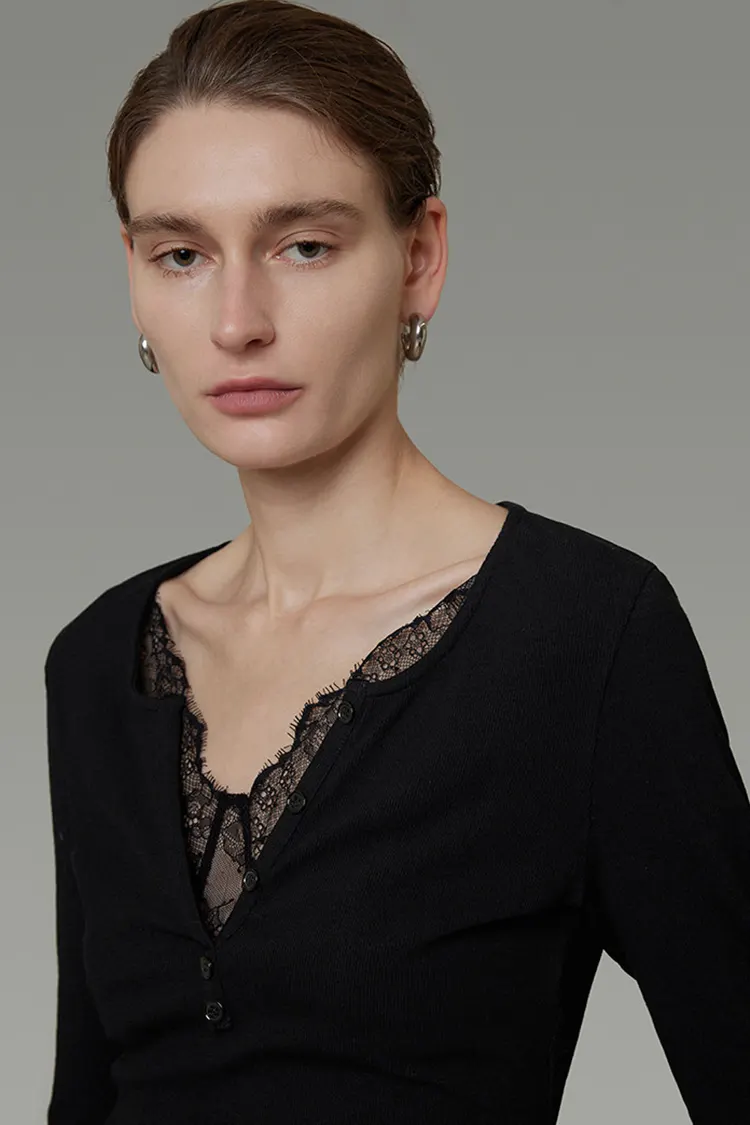 Le pull slim à col en V en dentelle pour femme présente une conception à boutons semi-ouverts, ce qui le rend plus facile à enfiler et à enlever. Il permet également d'ajuster la taille d'ouverture du col, répondant à divers besoins d'habillage. Les boutons simples correspondent à la couleur du vêtement, avec des détails exquis et robustes. Cela améliore non seulement l'aspect pratique, mais ajoute également de la profondeur à l'apparence générale, permettant de créer plusieurs tenues avec un seul vêtement, augmentant ainsi considérablement la fréquence de port pour les consommateurs finaux.