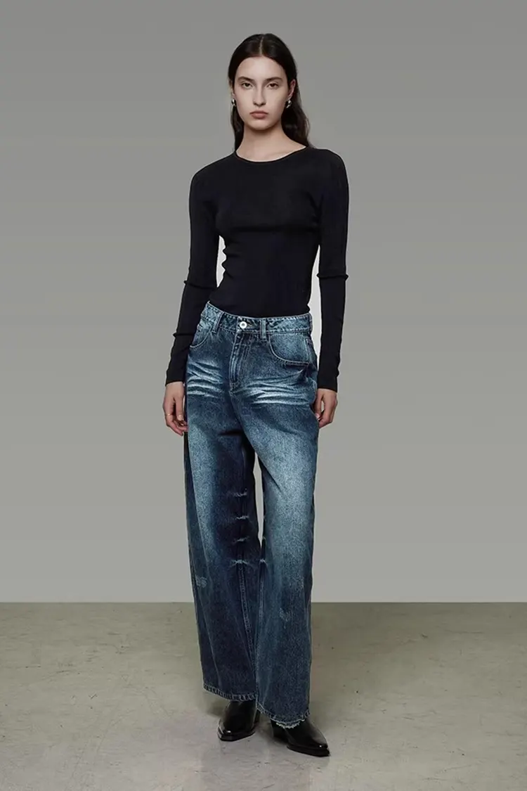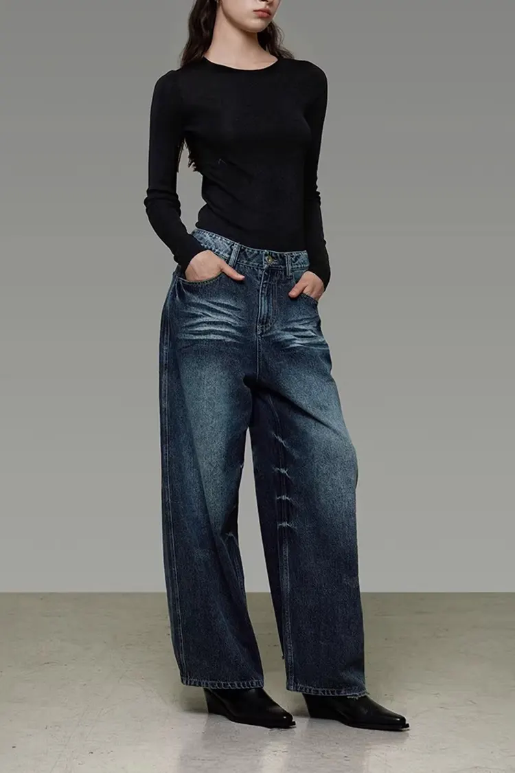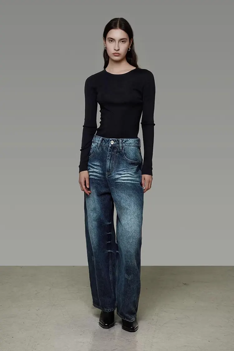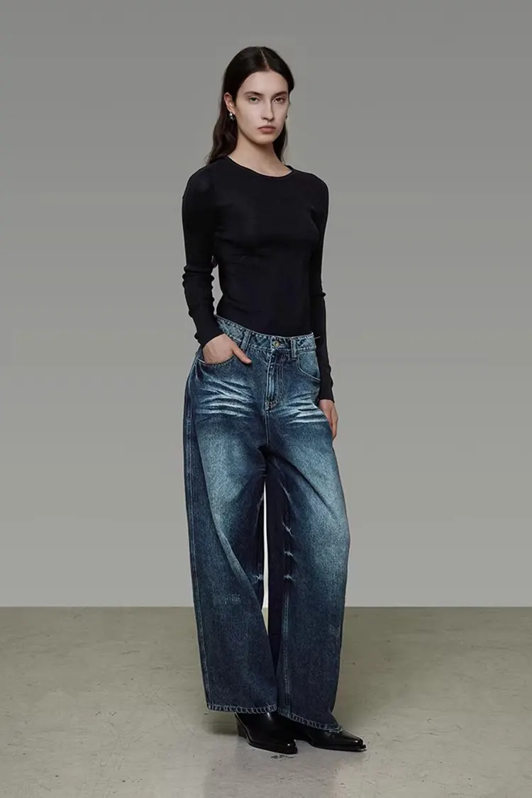 RUIFAN est un fabricant et fournisseur professionnel de vêtements pour femmes. Le pantalon large en denim délavé pour femme présente une taille haute et une coupe ample à jambes larges, qui donne un effet amincissant et améliore la forme de la jambe. Le tissu denim en coton mélangé est impeccable et confortable, avec une forte sensation rétro.